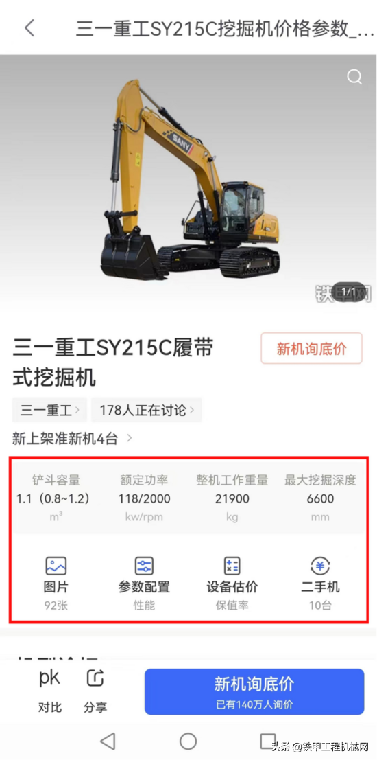 而获取价格信息,正好是铁甲产品库的第二大特色,因为在海量的用车报告正文及评论内容中,很多客户都会交流自己的购车经历,其中就包含当时的新机价格。在登录铁甲产品库后,通过点击新机询价按钮,用户可以一键询价,直接咨询厂家关于设备的新机报价。