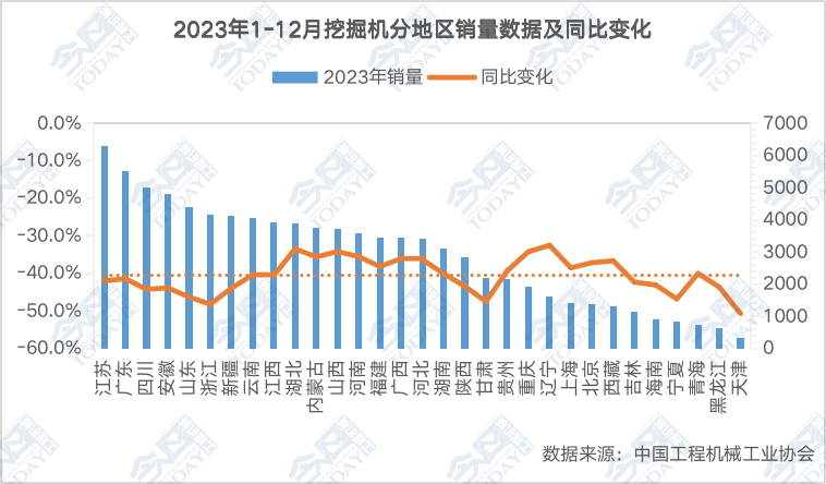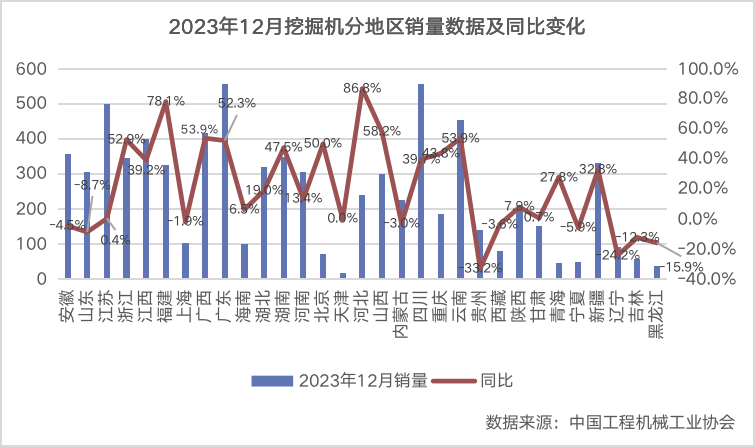 2023年12月挖掘机分地区销量数据及同比变化