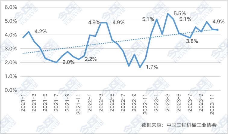 2023年北京地区除3月和4月份小幅下滑外,其余月份均为正增长态势,10月份涨幅高达70%。全年挖掘机销量在国内市场中的占比超1.5%。北京工程机械市场的发展状况好于国内其他大部分市场,背后的原因就在于高于全国均态的固定资产投资所带来的需求,包括高城镇化率之后的市政基础设施改善需求及高环保要求催生出的新基建与新能源领域建设。