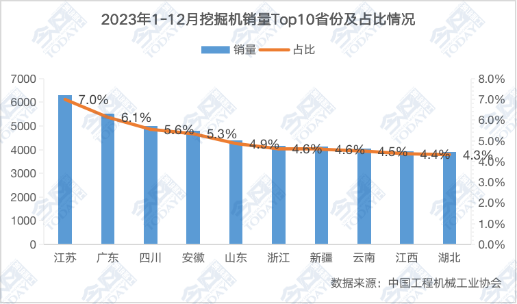2023年挖掘机销量排名前十省份及其在国内市场占比情况