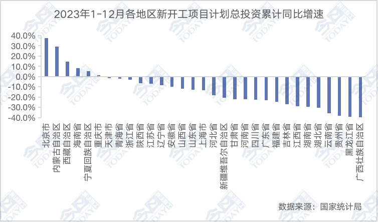 从需求端投资情况看,根据国家统计局数据,2023年1-12月份,固定资产投资(不含农户)503036亿元,同比增长3.0%。分地区看,东部地区累计同比增长4.4%,高于全国1.4个百分点;中部地区累计同比增长0.3%;西部地区累计同比增长0.1%;东北地区累计同比下降1.8%。