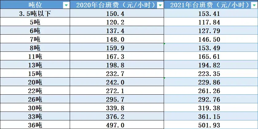 这份数据是基于每个吨位机型的平均台班费和平均小时价格的比值,也就是一个台班的费用相当于多少个小时的费用。