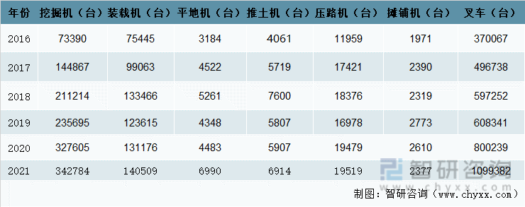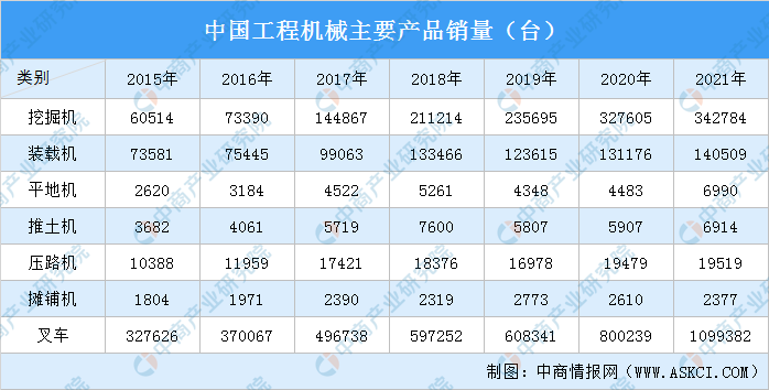 其中2021年中国挖掘机产品销量342784台,同比增长4.6%;装载机产品销量为140509台,同比增长7.1%;平地机产品销量为6990台,同比增长55.9%;推土机产品销量为6914台,同比增长17%;压路机产品销量为19519台,同比增长0.2%;摊铺机销量为2377台,同比下降8.9%;叉车产品销量为1099382台,同比增长37.4%。