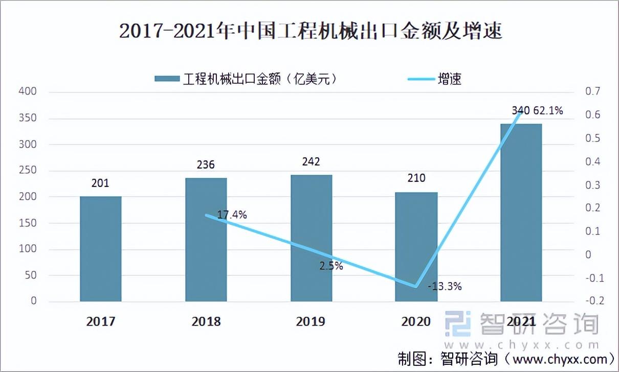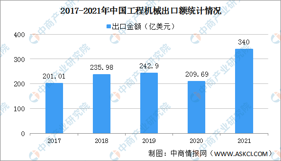 2020年受疫情影响,工程机械出口有所下降,2021年经济恢复,工程机械出口金额为340亿美元,同比增长62.1%。