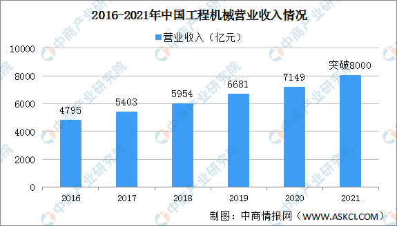 中商情报网讯:2021年即使在疫情肆虐全球的情况下,中国工程机械行业依旧呈现稳步发展的态势,工程机械产品销量持续增加,营业收入首次突破8000亿元,海外出口强势爆发。展望未来,基建需求旺盛,预计2022年工程机械行业有望延续增长,工程机械出口市场迎来发展黄金期。