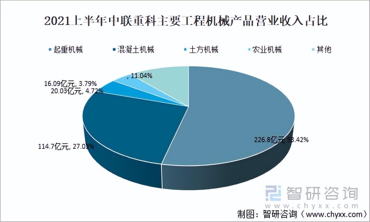 据公司年报,2021上半年中联重科工程机械产品中,起重机械营业收入为226.8亿元,占中联重科营业收入的53.42%。