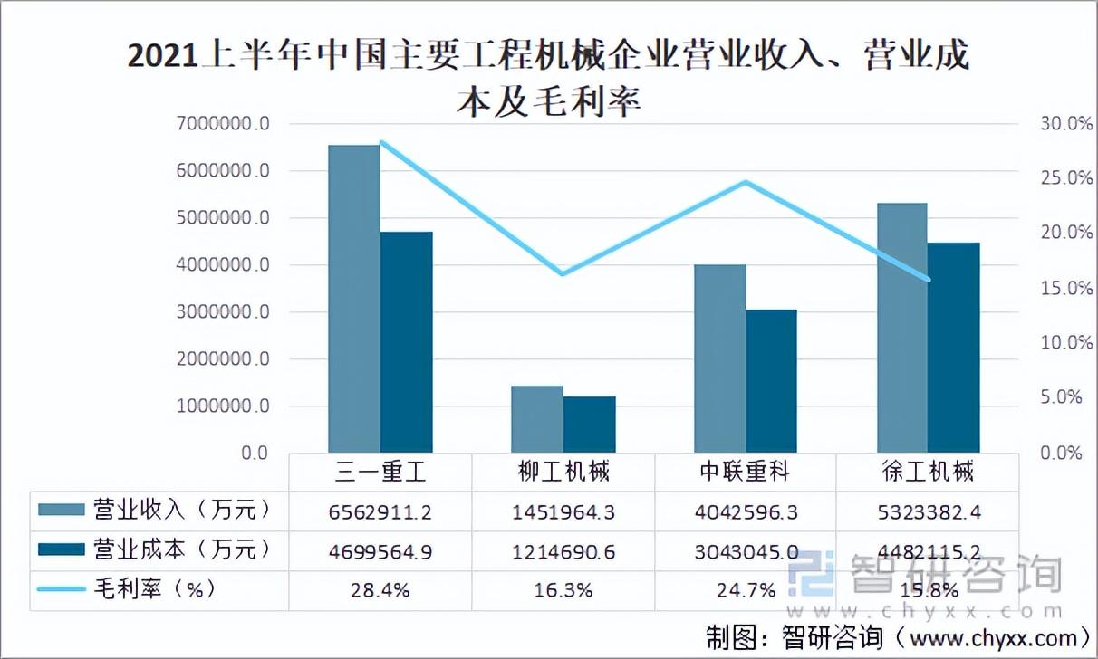 2021上半年中国主要工程机械企业营业收入、营业成本及毛利率