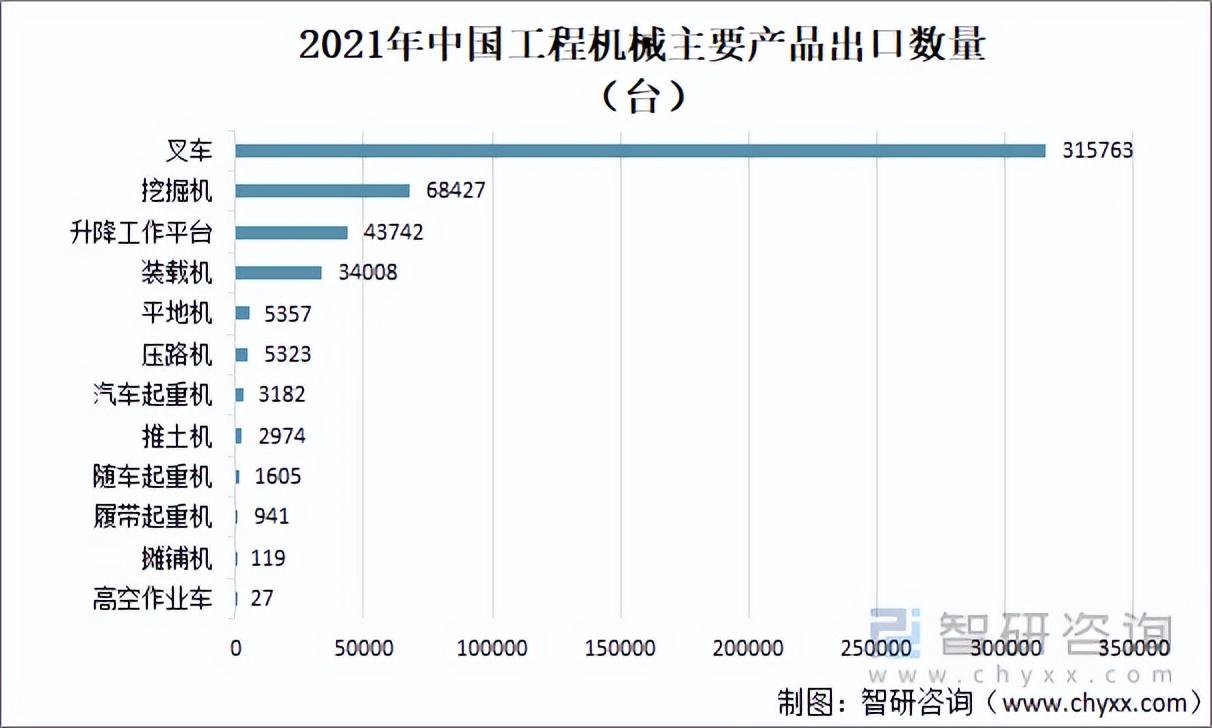 据中国工程机械工业协会数据,2021年中国工程机械中叉车出口数量为315763台;挖掘机出口数量为68427台;升降工作平台出口数量为43742台。