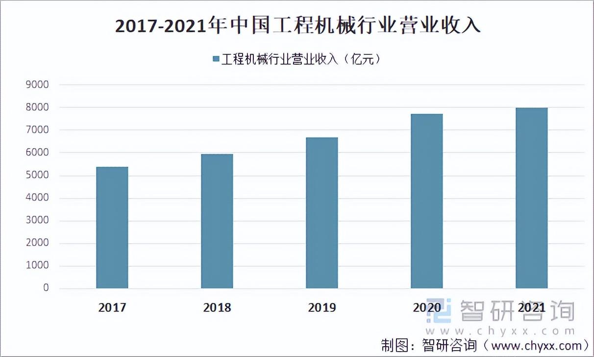 近年来,中国工程机械行业营业收入稳步增长。2017年工程机械行业营业收入突破5000亿元,2018年逼近6000亿元,2020年突破7000亿元,2021年全行业营业收入首次突破8000亿元。