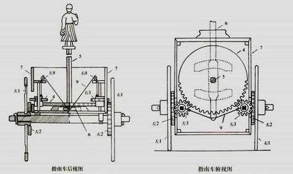 指南车的车身为一辕双轮车,车箱为重构结构,上立一本人,引臂南指。车箱内部设置有一套可自动离合的齿轮传动机构。当车子行进中偏离正南方向,向东(向左)转弯时,车辕前端向左移动,而后端向右(向西)移动,即将右侧传动齿轮放落,使车轮的转动能带动本人下方的大齿轮向右转动,恰好抵消车辆向左转弯的影响,使木人手臂仍指南方。当车子向西(向右)转弯时,则左侧的传动齿轮放落,使大齿轮向左转动,以抵消车子右转的影响。而车子向正前方行进时,车轮与齿轮系是分离的,因此木人手臂所指的方向不受车轮转动的影响。如此,不管车子的运动方向是东西南北,或不断变化,车上木人的手臂总是指向南方,起着指引方向的作用。