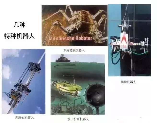 特种机器人:在潜水、管道修理、外科手术、生物工程、军事、星际探索等领域应用,承担着许多由人的直接操作无法完成的工作。