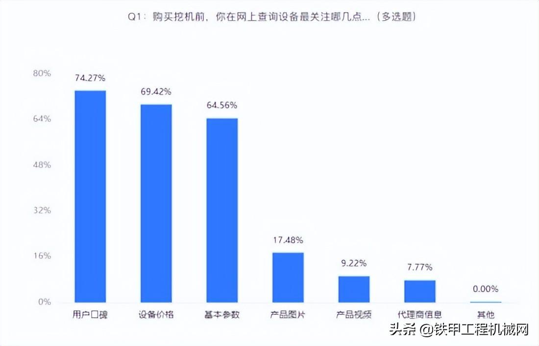 我们对上千名铁甲用户围绕购机行为进行了多项网络调查,调查结果显示,在购机之前,用户通过网上查询设备,最关注的方面如下:74.27%的用户关注产品的口碑,69.42%的用户关注设备价格,64.56%的用户关注基本参数,此外,还有不同程度占比的用户群体关注产品图片、产品视频及代理商等信息。对于用户最关注的产品口碑信息,尽在铁甲产品库!
