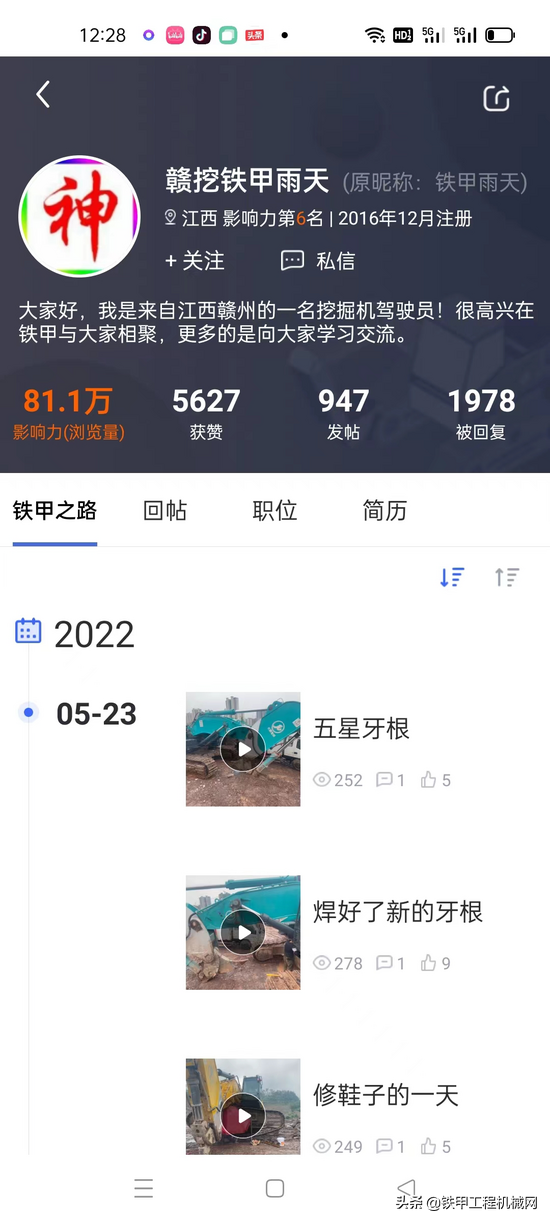 另外一位甲友@赣挖铁甲雨天是来自江西赣州的曾先生,他是在2016年12月加入铁甲大家庭的。目前,他在铁甲的总影响力数值达到了81.1万,位居江西区域影响力榜单第6名。正如上文所讲,在2022年的1-4月的“甲友影响力之星”评选活动中,曾先生已经连续4次上榜,而且每次的排名均在前两名。作为入行12年的老司机,曾先生对于20吨以上尤其是50吨的挖掘机了如指掌, 另外具备出色的视频剪辑能力,经常在论坛以视频的形式分享一些大型设备的维修保养经验以及说车视频,为广大用户提供了经验参考。