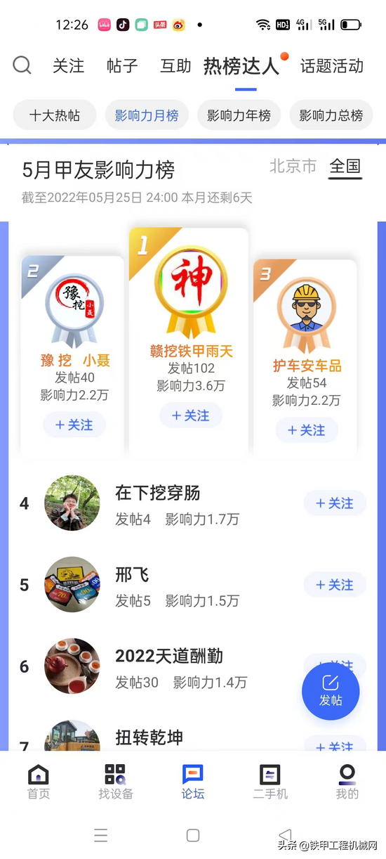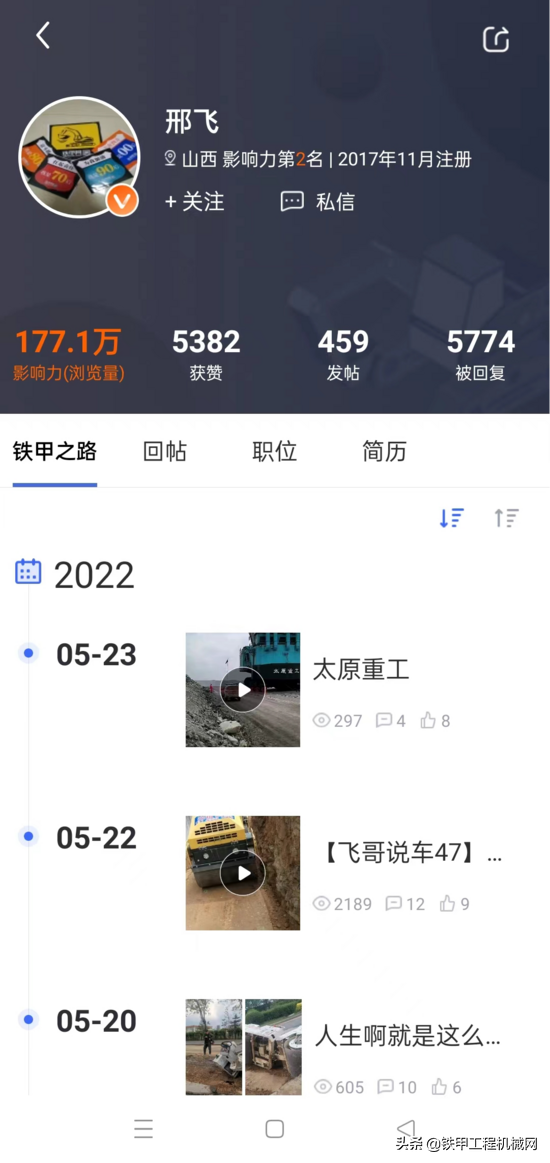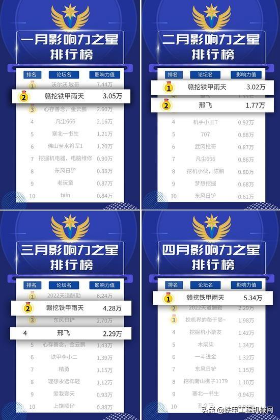 在铁甲论坛统计的2022年5月份甲友影响力全国排行榜上(截至5月25日24点),甲友@赣挖铁甲雨天位列首位,影响力达到3.6万,而甲友@邢飞排名第五,影响力为1.5万。由此可见,两位甲友是铁甲上百万用户中的佼佼者,也获得了广大甲友的认可。
