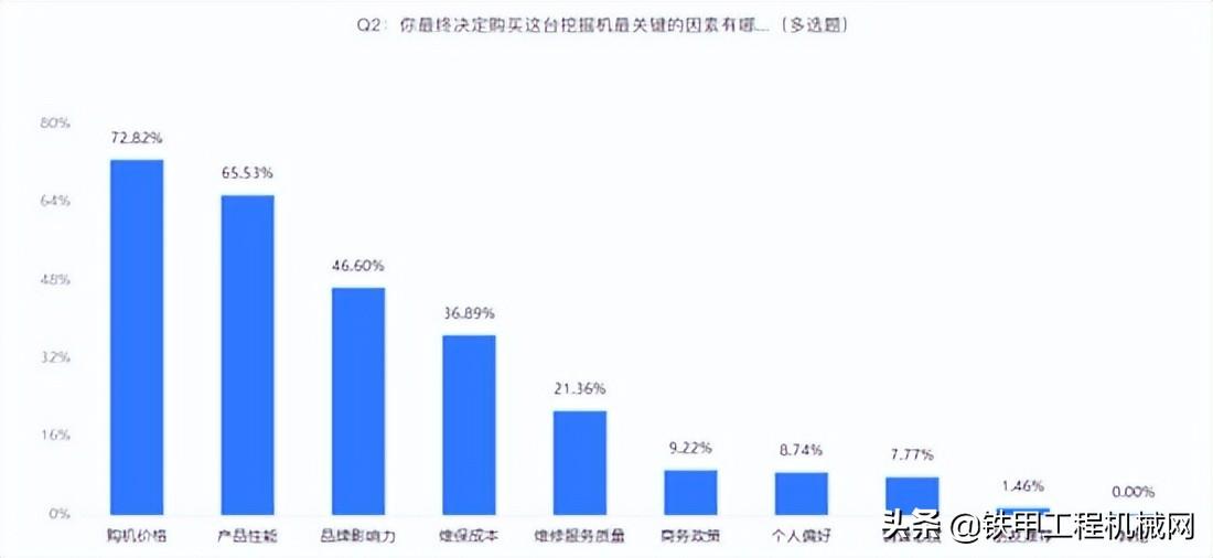 在同上的多项网络调查中,相关结果显示,最终决定购买挖掘机的最关键因素如下:72.82%的用户选择购机价格,65.53%的用户认为是产品性能。当然,还有品牌影响力、维保成本、销售态度和个人偏好等因素的占比均小于50%。因此,“价格”也成为影响用户最终购买设备的最关键因素。如果在购买设备之前,用户能够及时了解到产品价格相关信息,无论是新机价格、二手机价格,甚至是租赁价格,对于用户购机都是非常有价值的参考。