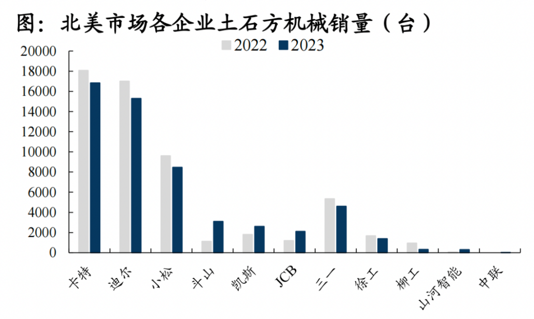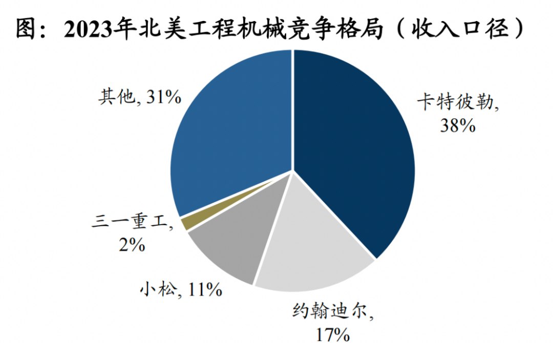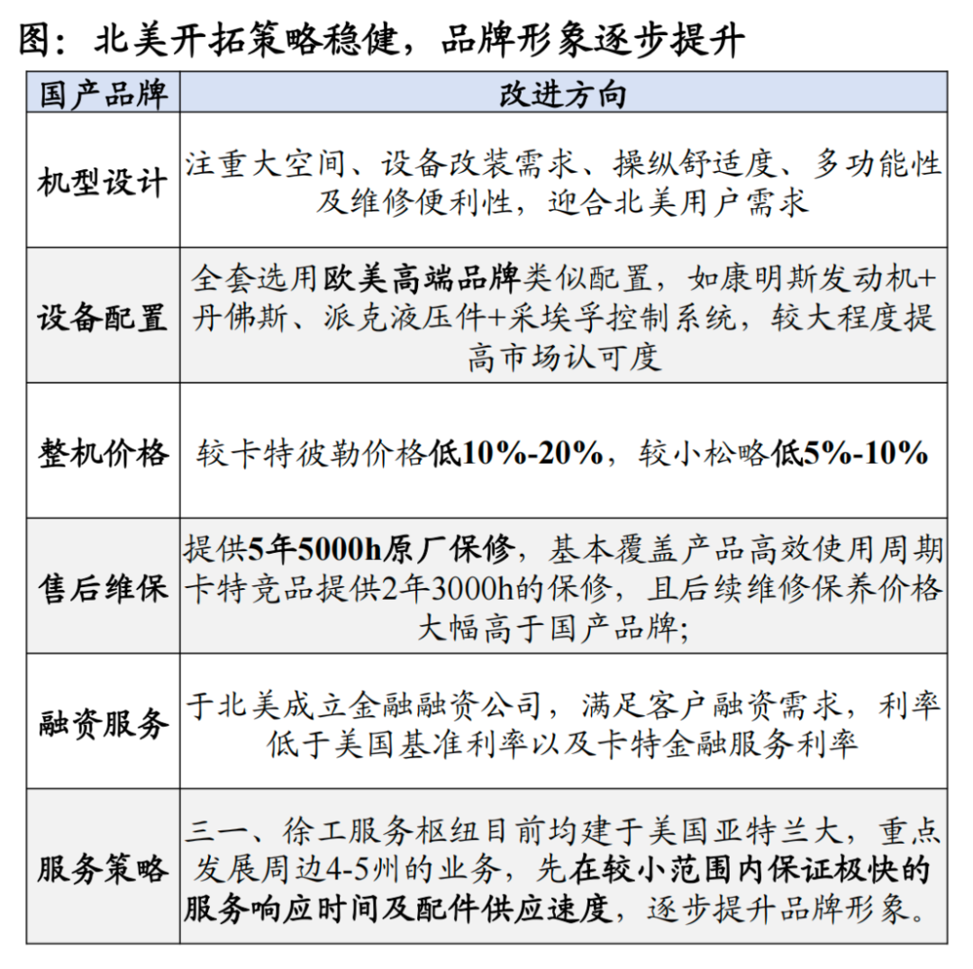产品、渠道&服务三重发力,国产品牌积极开拓北美市场。①产品:于北美使用康明斯+派克等北美本土高端零部件以提升市场认可度,挖机性能不输卡特小松;②渠道:三一美国任命前卡特营销与经销商运营总监为新任CEO,引进丰富经销商资源。③服务:三一、徐工于北美提供五年原厂质保,建立服务枢纽与服务网点,服务半径内48小时完成售后保修服务,解决部分北美客户“买得起修不起”的难题。