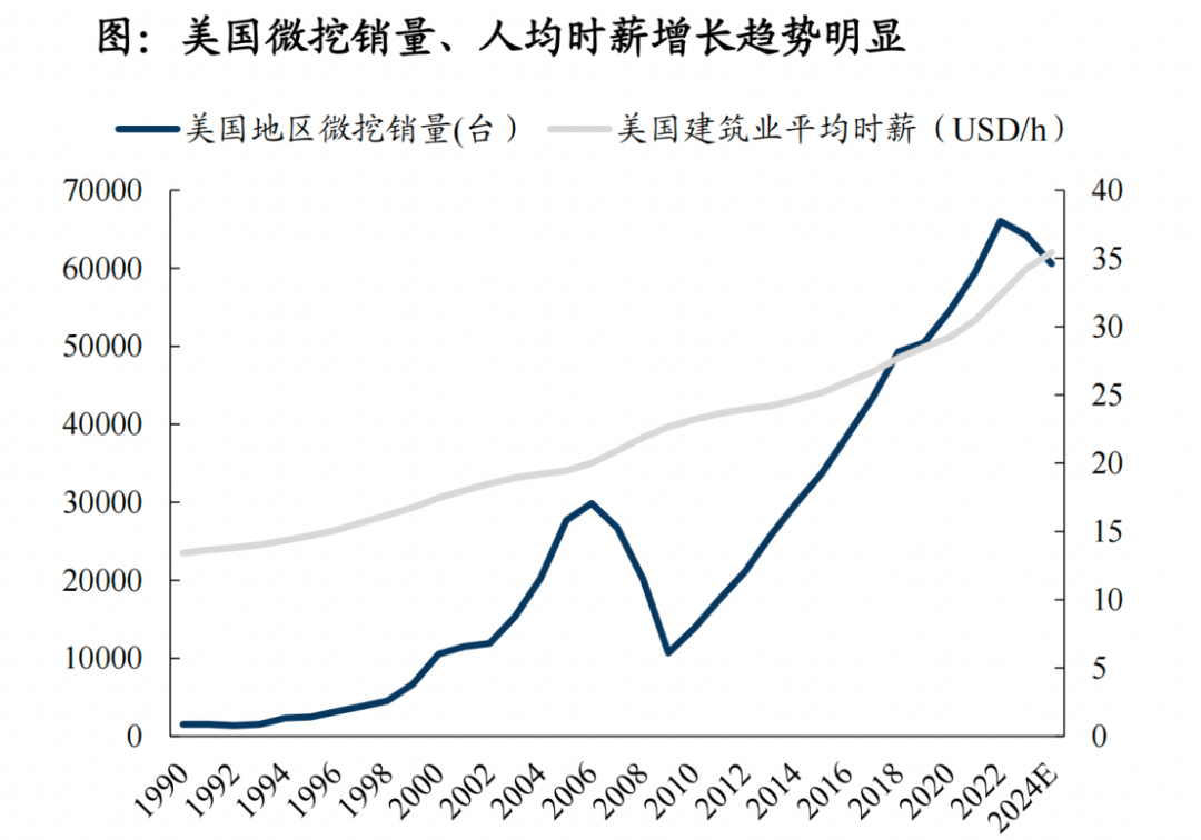 机器替代人需求紧迫,微小挖占比持续提升。2024年6月美国建筑业生产和非管理人员平均时薪同增4.6%,达到每小时35.64美元,工人的缺乏将严重限制建筑业的发展。微挖作为机器替人主力,北美需求持续高增。2023年销量已超60000台,搭配各类属具可以满足各种工况需求。据Off-Highway预计,微小挖的强势表现将在未来五年内保持强劲。
