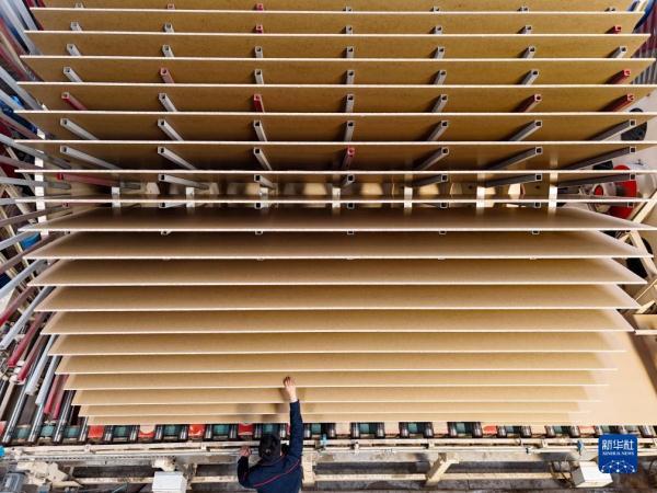 10月21日, 在山东省临沂市兰山区新港集团的生产车间,车间工人在对刚下线的刨花板进行外检(无人机照片)。