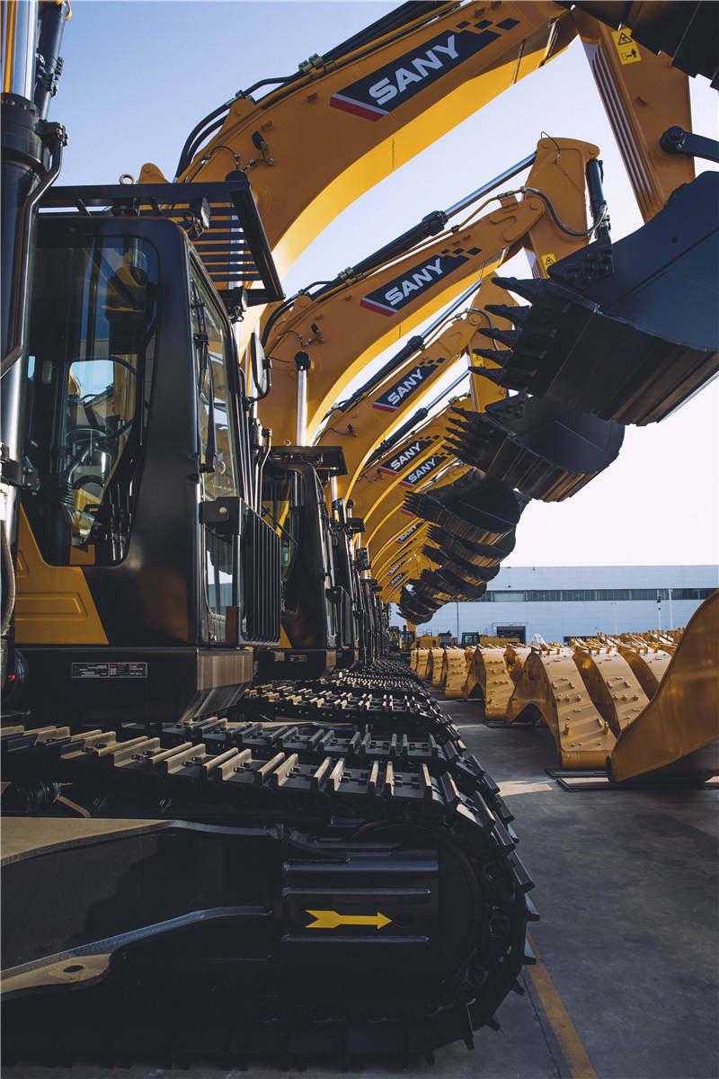 三一重工挖掘机在中国市场的销量占比将近30%,独占鳌头。它的研发总部坐落于苏州的昆山,大部分挖掘机也在这里生产。占地3000亩的厂区,映入眼帘的是厂区中央一条宽阔的草坪,东西两侧各六栋厂房依次排开。自从今年3月国内复工复产以来,工地陆续开工,挖掘机的销量就疯狂反弹,从今年年初基本归零,到全国所有挖掘机企业一个月内卖出近5万台挖掘机,占几乎去年全年国内销量的四分之一。与之相应,当我在10月初来到三一在昆山的厂区,草坪北面广场停满了等待出货的挖掘机,体型大如重型坦克,小如超市仓库的叉车。