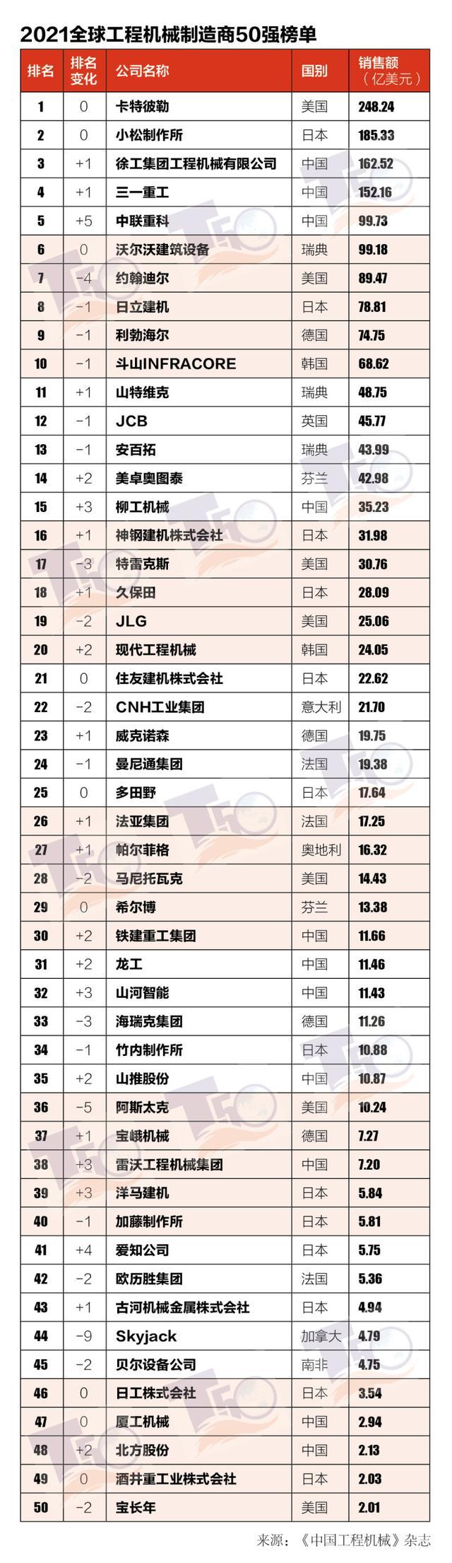 在2021全球工程机械制造商50强榜单上,11家中国企业上榜,13家日本企业上榜,7家美国企业入榜。从销售额看,11家上榜中国工程机械制造商,销售额为507.33亿美元,比上年增长40.03%,中国的排名由全球第三升至全球第一。