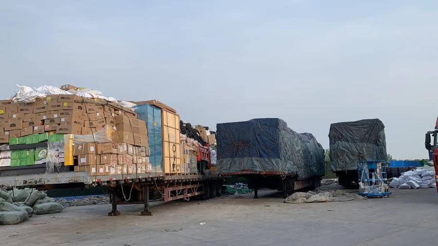 4月14日上午,永昌物流在济南桑梓店4.5万平方米的货场上,7辆装满货物,装载量达30吨的大货车,正在等待发运。