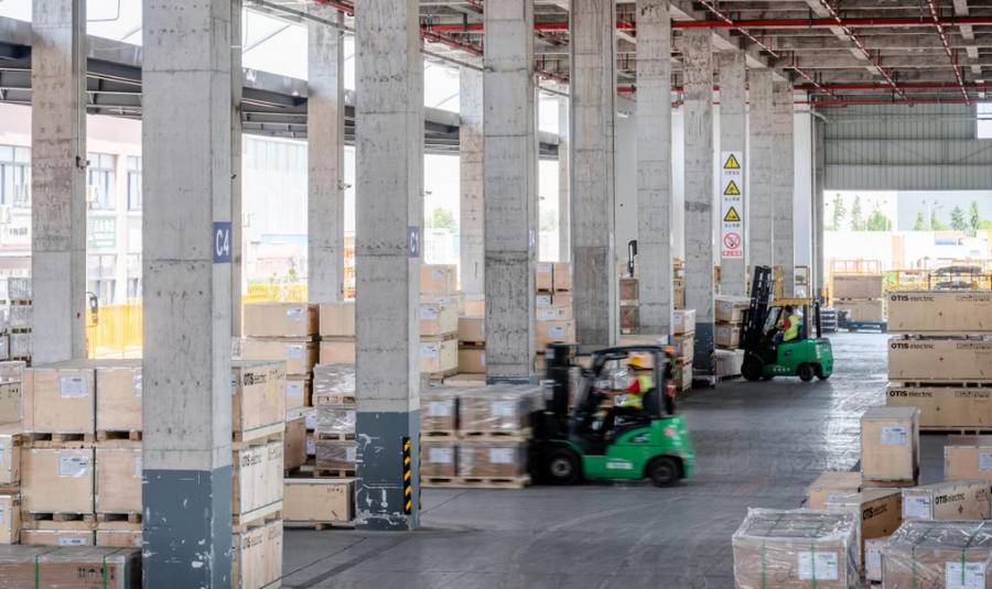 在杭州,某电梯制造商在华东的物流中心疫情期间依旧有序运作。