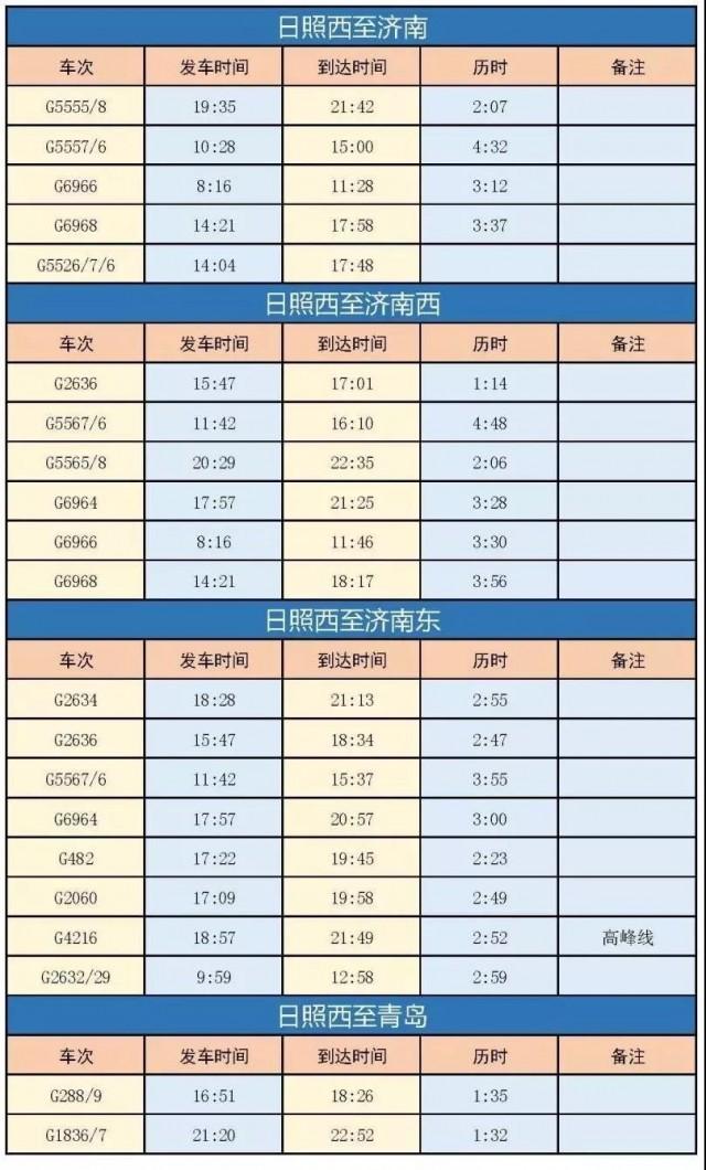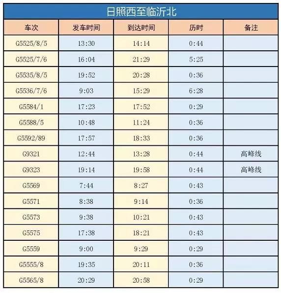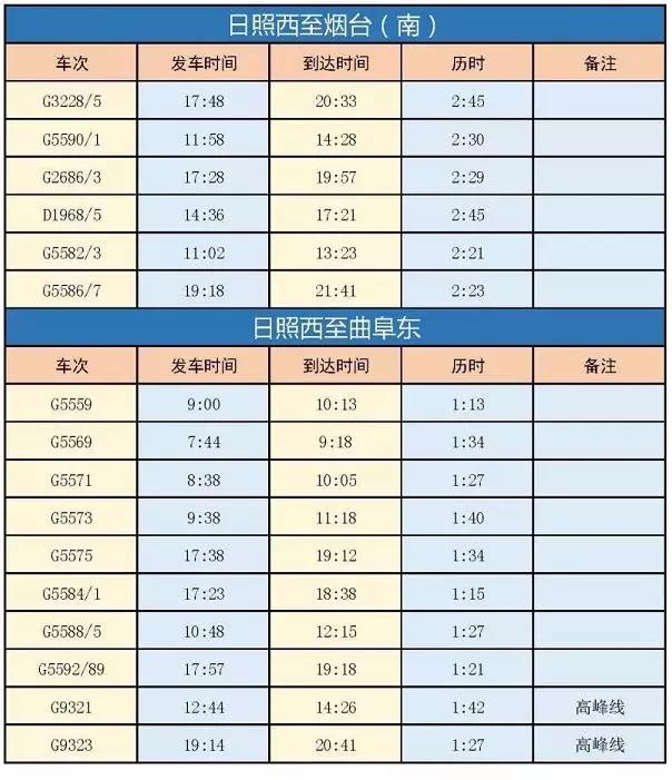 济南西至岚山西2对,济南西至日照西1对,济南西至济南西1对,董家口至曲阜东2对,曲阜东至威海2对,曲阜东至烟台1对,青岛北至曲阜东4对,临沂北至临沂北2对,济南至济南1对,淄博北至曲阜东1对,烟台至襄阳东1对,青岛北至杭州1对,青岛北至盐城2对,威海至盐城1对,沈阳至盐城1对,济南东至连云港1对,济南西至盐城1对,威海至兰州西1对,青岛北至襄阳东1对,长沙南至青岛1对,重庆西至青岛1对,青岛北至郑州东1对,石家庄至盐城1对,北京南至盐城2对(高峰线1对)。