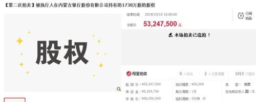 在阿里司法拍卖网站,仅10月10日当天截止的、涉及银行股权的拍卖就包括:内蒙古银行1730万股、江西寻乌农商银行173.39万股、江西安义农村商业银行2.26万股股权、宁夏黄河农村商业银行6.40万股、山东邹平农村商业银行104.41万元股权等。
