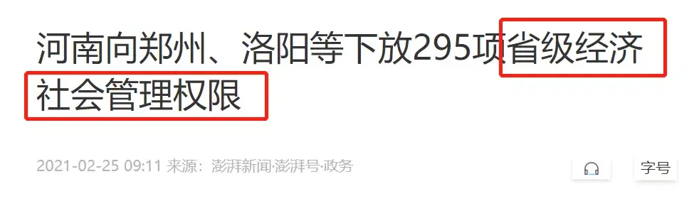 其一,去年以来,河南多次向郑州、洛阳同时下放部分省级经济社会管理权限。