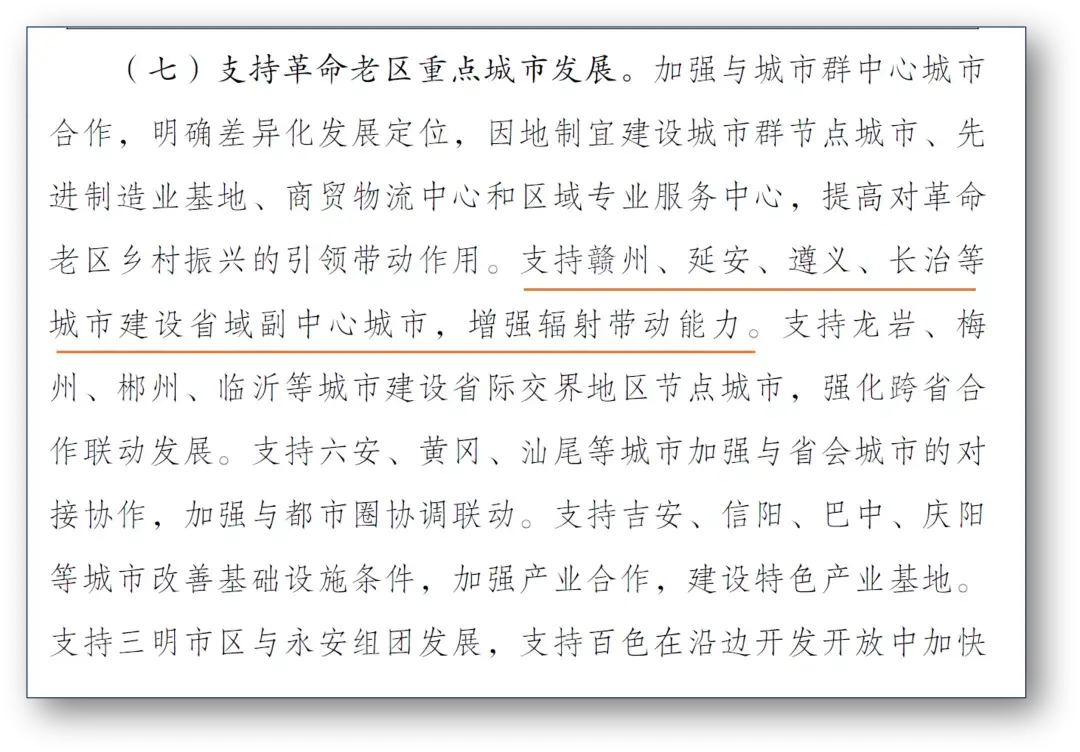 在“革命老区”文件中,明确提出“支持革命老区重点城市发展”: