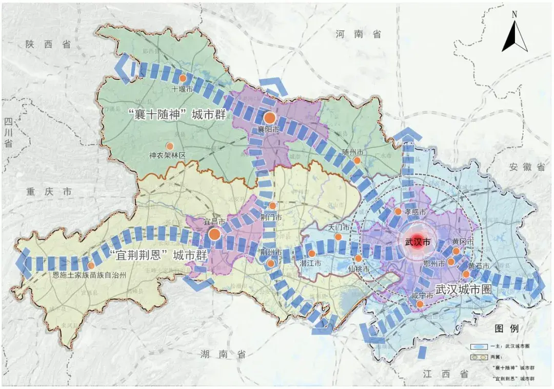 “襄十随神”、“宜荆荆恩”分别作为两翼而存在,一北一南,共同引领湖北区域发展。