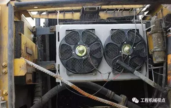 挖掘机常年处于恶劣环境下作业,所以经常会有大量的灰尘,小杂物堵住液压散热器和水箱散热器外部,特别是液压油散热器有少量漏油现象,容易把在后面的水箱散热器给堵住(灰尘直接附着在液压油上),所以大家要注意看有没有液压散热器漏油。因为挖掘机的发动机的风扇都是把风从液压油散热器往发动机方向吸入进行散热。所以当发动机把风吸进来同时也夹带了灰尘,这样就导致了灰尘会沾在漏了油的液压散热器上面,使散热器不能很好的散热,水温接着就高了起来!