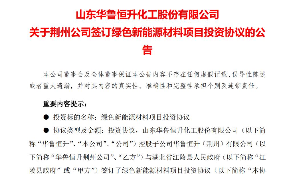 1、2021年4月15日,华鲁恒升发布公告,华鲁恒升荆州公司于 2022 年4月13日与江陵县签署《绿色新能源材料项目投资协议》。