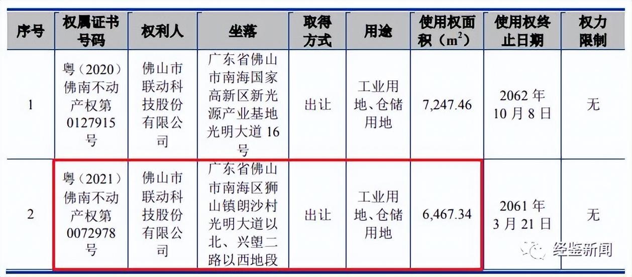 招股说明书同时披露,本次扩产及研发中心选址为位于佛山市南海区狮山镇朗沙村光明大道以北、兴塱二路以西地段,土地用地面积为6,467.34平方米,场地购置费用合计为493.18万元。