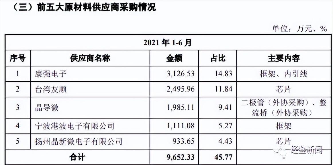 但据蓝箭电子招股说明书披露,2021年1-6月,该公司第四大和第五大供应商分别为宁波港波电子有限公司和扬州晶新微电子有限公司,采购金额分别为1,11.08万元和933.65万元。