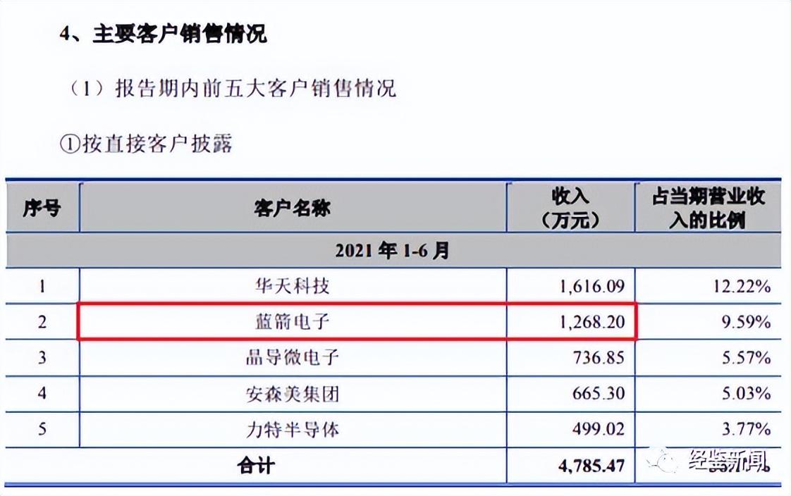 招股说明书披露,2021年1-6月,蓝箭电子为联动科技第二大客户,联动科技对其销售金额为1,268.20万元,占当期营业收入的比列为9.59%。