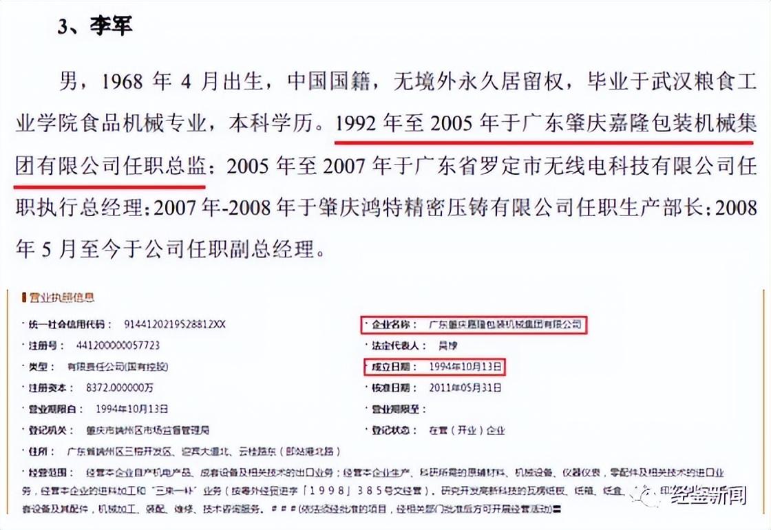 但据工商资料显示,嘉隆包装机械于1994年才注册成立,不知李军先生是如何提前两年入职一家并不存在的公司的?其履历是否真实有效?