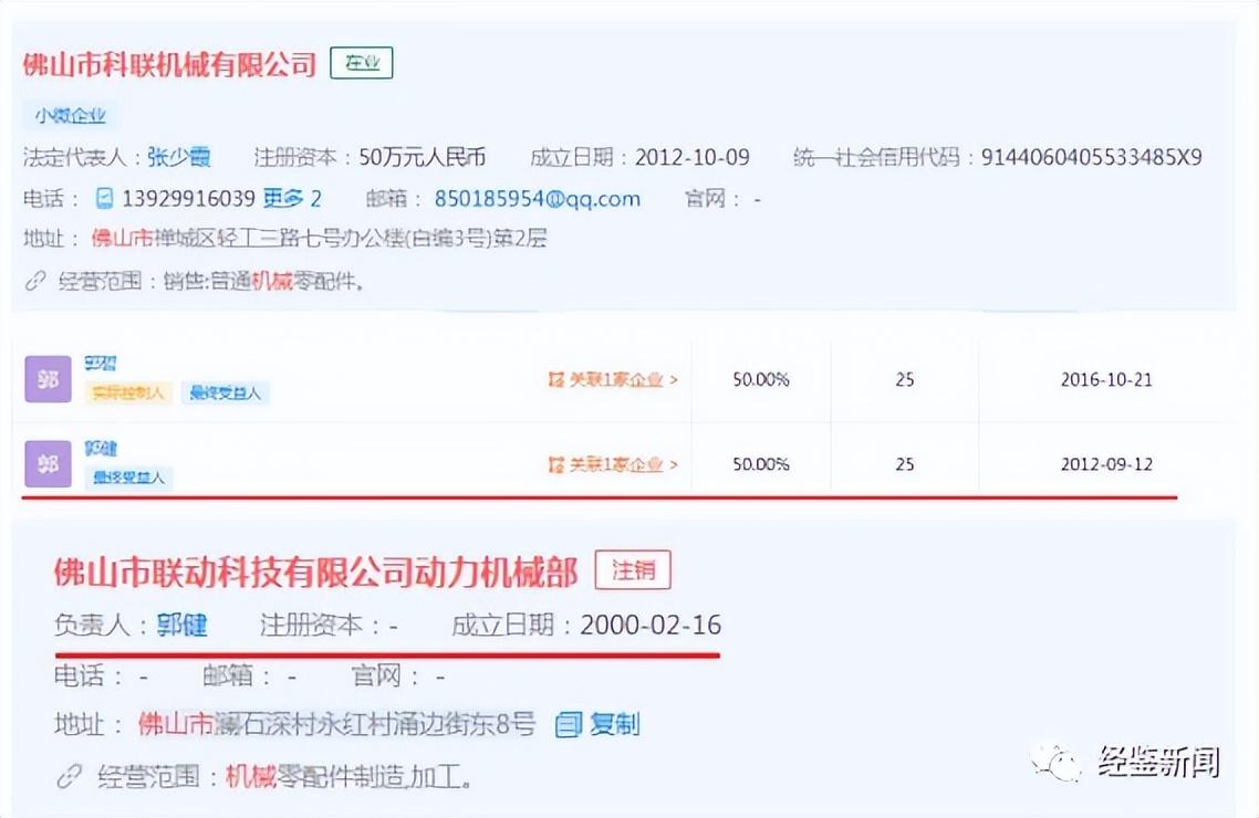 但工商资料显示,科联机械的股东却是郭哲、郭健,而郭健是佛山市联动科技有限公司(联动科技前身)动力机械部负责人。