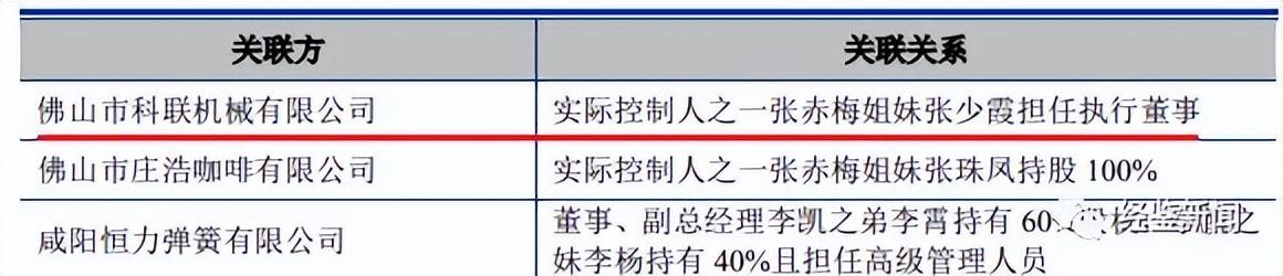 值得注意的是,招股说明书披露,佛山市科联机械有限公司(以下简称“科联机械”)是联动科技实际控制人之一张赤梅姐妹张少霞担任执行董事的企业。