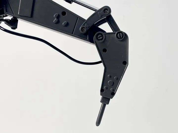 遥控挖掘机配备了三种操作头,挖斗、钻头、抓手,三种模式切换,玩法多样。其中,钻头、抓手比挖斗多出一根线与小臂相连,当按住遥控器顶部按键时,可以实现钻头震动钻探、抓手开合抓握的功能。
