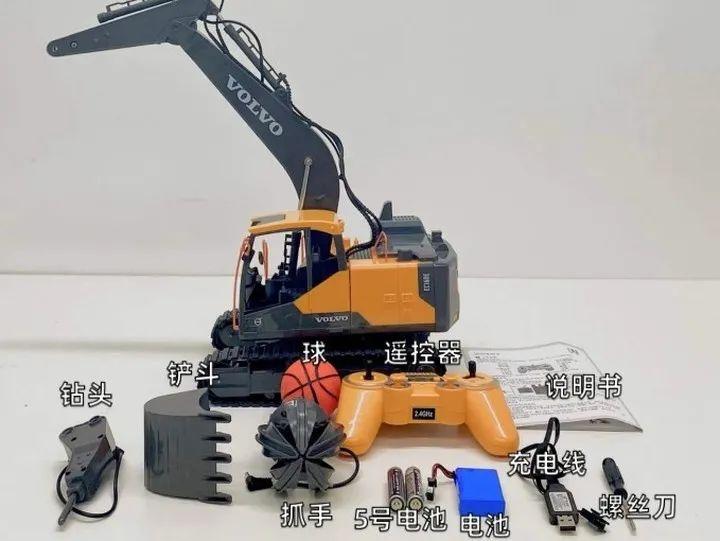 除了挖掘机本体,配件套装还包括:三种操作头(挖斗、钻头、抓手)、两节五号遥控器电池、挖掘机电池及充电线、小球。