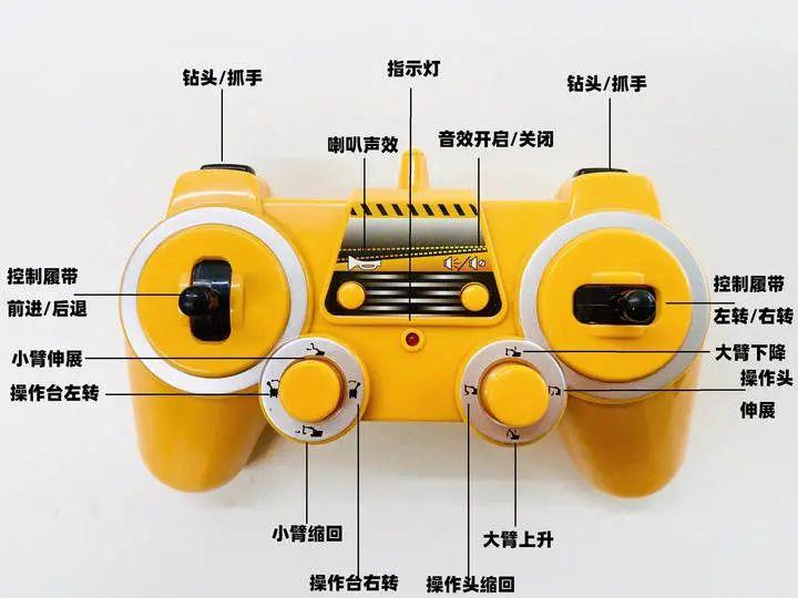17通道对应17种功能,通过遥控器可对挖掘机的大臂、小臂、操作台、操作头和履带等部位进行独立操作,实现旋转、挖臂升降等17种功能,但标识较为抽象,大人小孩上手都需要花点时间。当各关节超过可操作范围时,会发出“咔咔”声,提醒玩家调整。