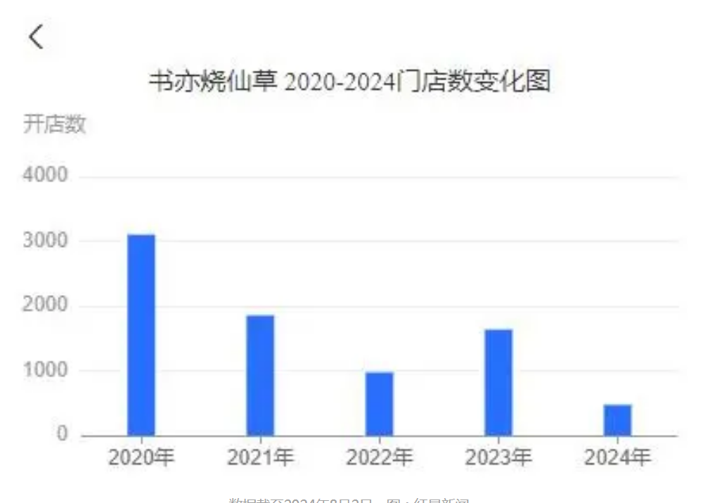 据窄门餐眼数据,截至2024年8月2日,书亦烧仙草在营门店数有5965家。今年6月,窄门餐眼数据显示书亦烧仙草在营门店数近6300家。2021年9月,书亦烧仙草曾宣布门店数量超过7000家。