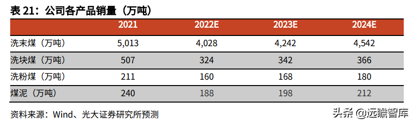预计公司主要产品销量如下: 预计2022-2024年洗末煤销量为4028/4242/4542万吨。