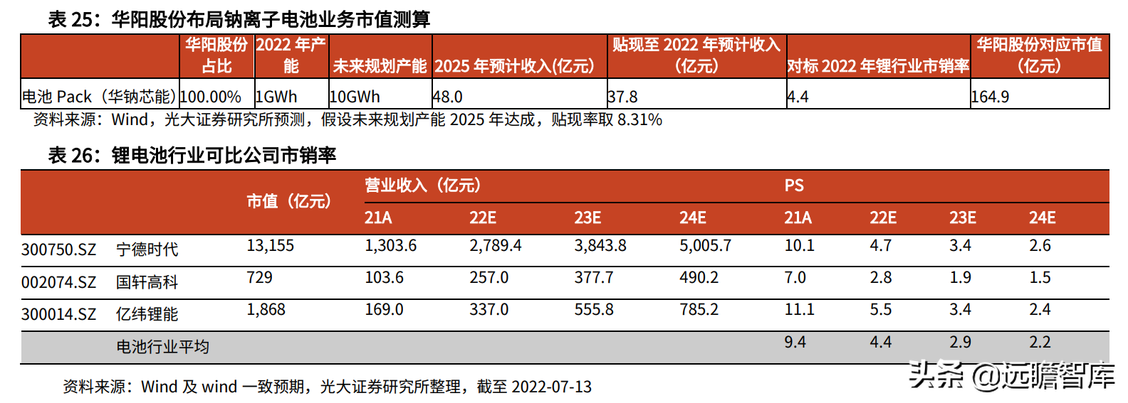 钠离子电池部分,考虑到钠离子电池目前尚未产业化,我们通过估算其营业收入参照目前锂行业的 PS 对钠离子电池业务进行估值。