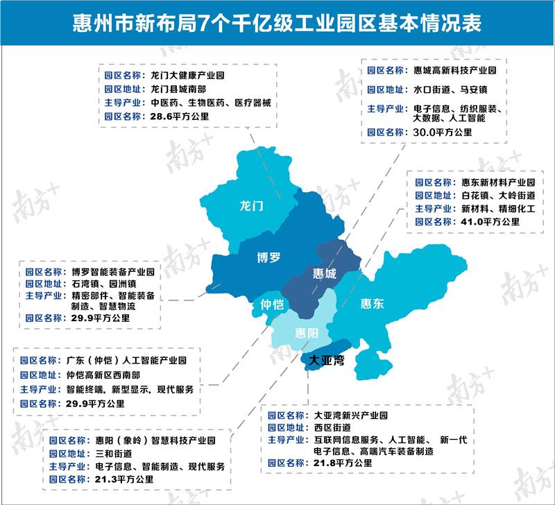 今年5月,《惠州市实施工业园区提质增效行动方案》印发。惠州将以“千亿园区,万亿产业”为目标,以打造“3+7”工业园区为抓手,把工业园区建设成全市产业转型升级与创新发展的先导区,形成制造业创新集聚高地、绿色发展高地和营商服务高地。除大亚湾区、仲恺高新区和中韩(惠州)产业园等3个国家级园区外,惠州7县(区)各新建1个千亿园区。