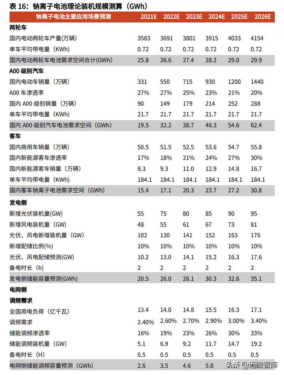 我们根据以上潜在应用场景(电动自行车、A00 电动车、客车、UPS 储能、发电侧、电网侧、用电侧储能)测算了钠离子电池理论装机容量,核心假设包括:根据 WIND 数据,2021 年 1-8 月国内电动自行车产量 2388.8 万辆,我们假设年化后国内电动自行车产量 3583 万辆,2015 年-2021 年 CAGR 约 3%,假设按照单车带电量 0.72KWH 计算,2022 年以后电动自行车产量增速仍为 3%,预 计 2026 年国内电动自行车产量 4154 万辆,对应带电量 29.9GWh;