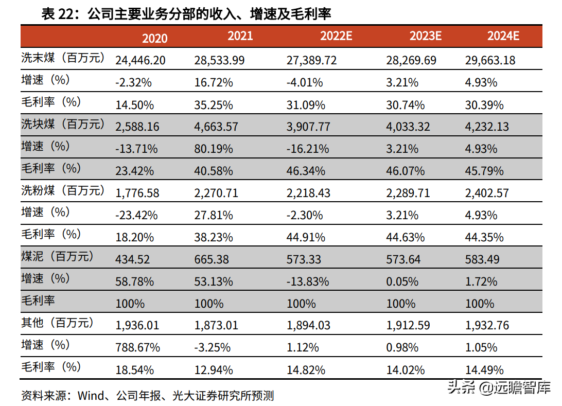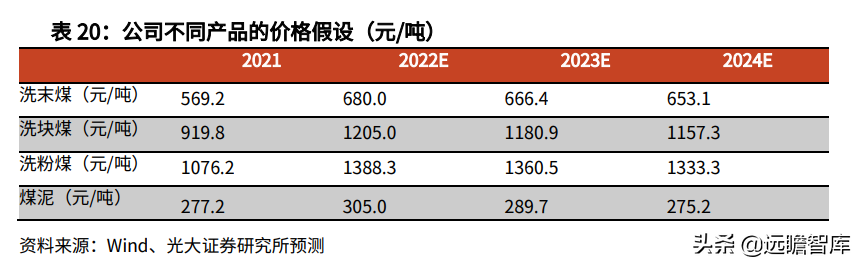 因此对公司主要产品价格作如下预测:预计2022-2024年洗末煤价格为 680 元/吨,666.4 元/吨,653.1 元/吨;预计2022-2024年洗块煤价格 1205 元/吨,1180.9元/吨,1157.3元/吨;预计2022-2024年洗粉煤价格1388.3元/吨,1360.5 元/吨,1333.3 元/吨。预计 2022-2024 年煤泥价格为 305 元/吨,289.7 元/吨, 275.2 元/吨。