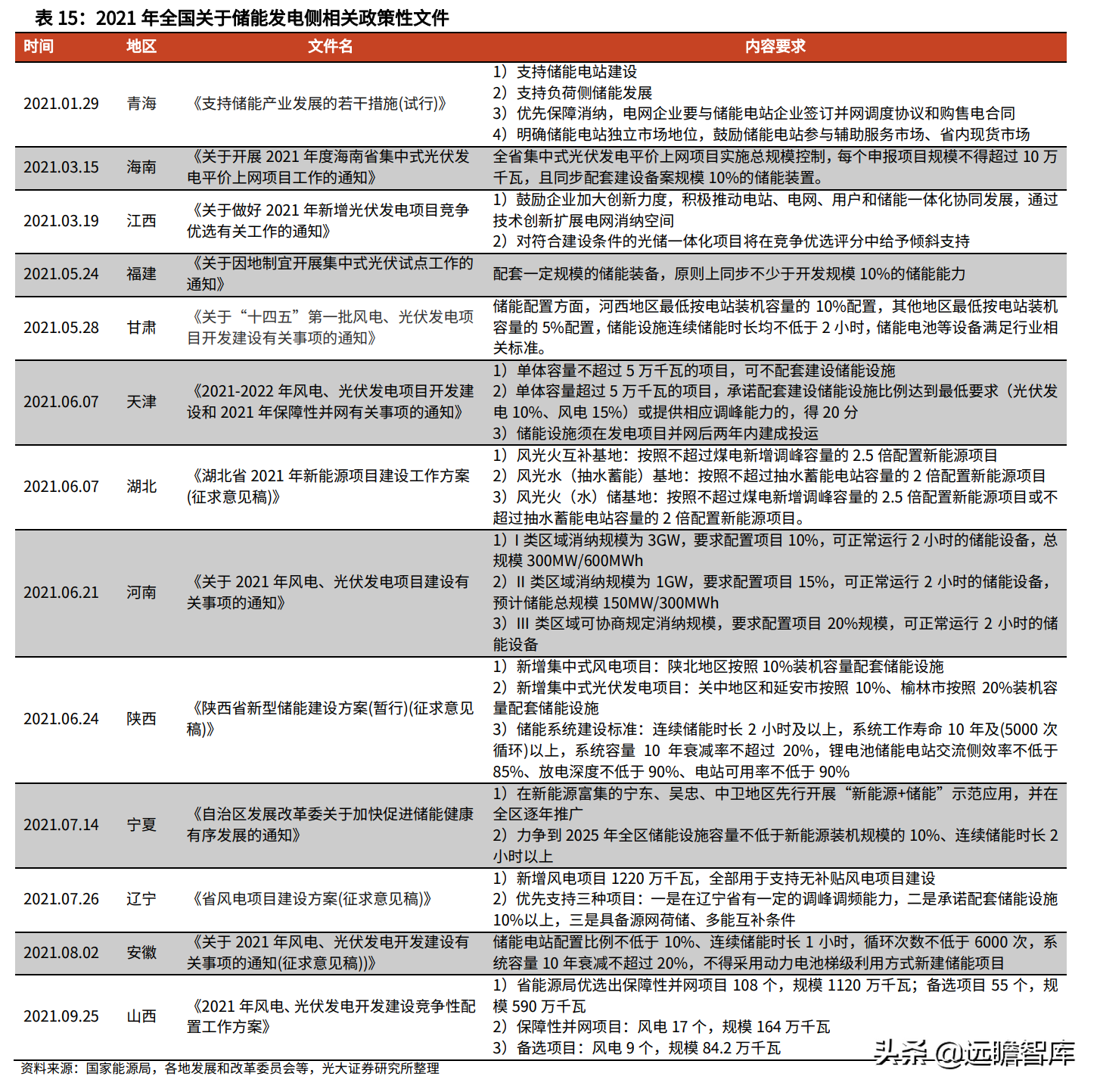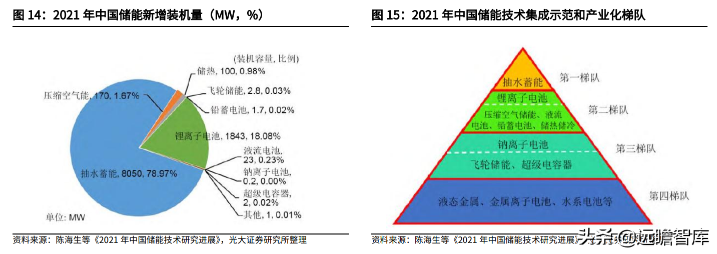 根据前文每年新增的装机规模测算,预计 2026 年全国风电累计装机容量和光伏累计装机容量分别为 664GW 和 731GW,假设日波动率为 35%,配储时长 2 小时。根据光大证券报告《储能,碳中和下的新兴赛道,万亿市场冉冉开启》,调峰容量占比由2021 年的 0.44%上升至 2026年的2.2%,预计 2026 年国内调峰容量 21.48GWh;