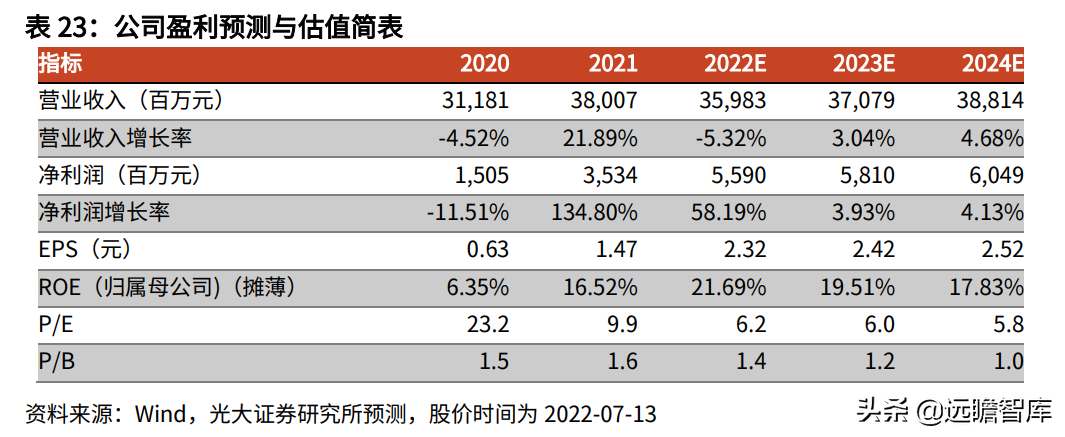 我们预计公司2022-2024年归母净利润分别为55.9亿元、58.1亿元、60.5亿元,同比增长58.2%、3.9%、4.1%,当前股价对应 PE 分别为6.2X、6.0X、5.8X。